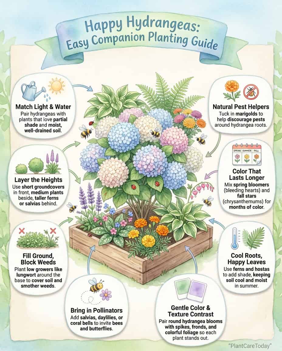 Are your hydrangeas standing alone? They could use some company. Hydrangeas actually do much better when you plant the right companions nearby. These pairings can boost plant health, extend blooming