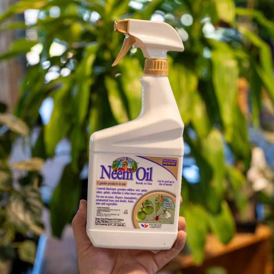 It’s usually best to apply neem oil at dusk or dawn when treating outdoor plants to minimize the risk of beneficial insects coming in contact with it.