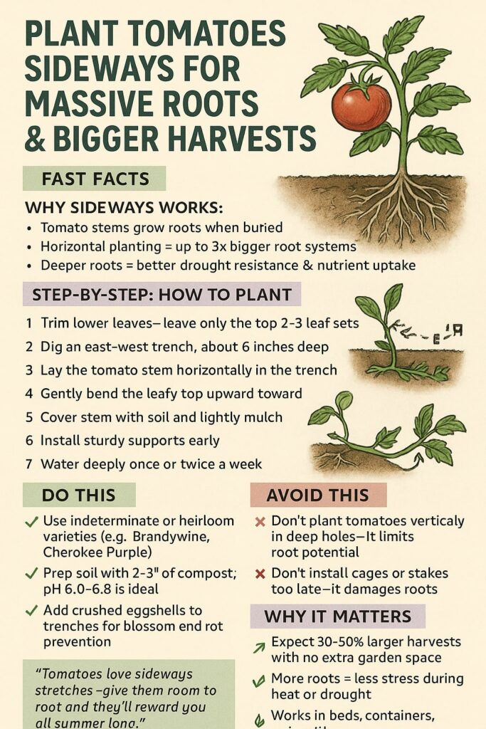 It’s simply planting your tomatoes sideways. This game-changing technique creates root systems so powerful that your plants will flourish like never before. The best part? It takes zero extra effort!