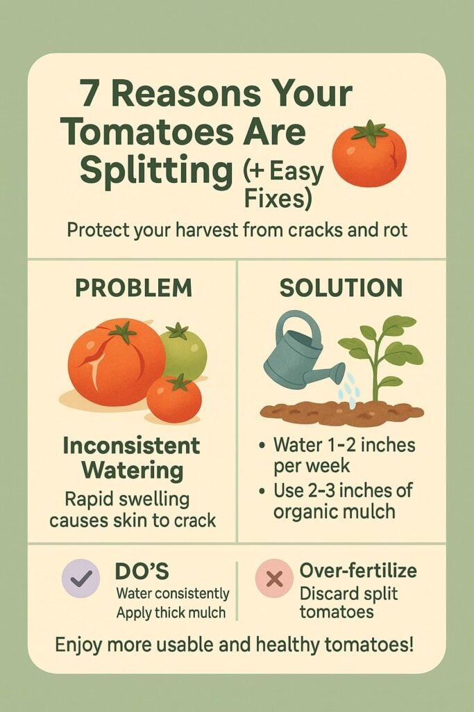 • Water Rollercoaster: When soil goes from bone-dry to soaking wet, your tomato absorbs water like a desperate sponge. The inside swells, the skin can’t keep up, and POP!